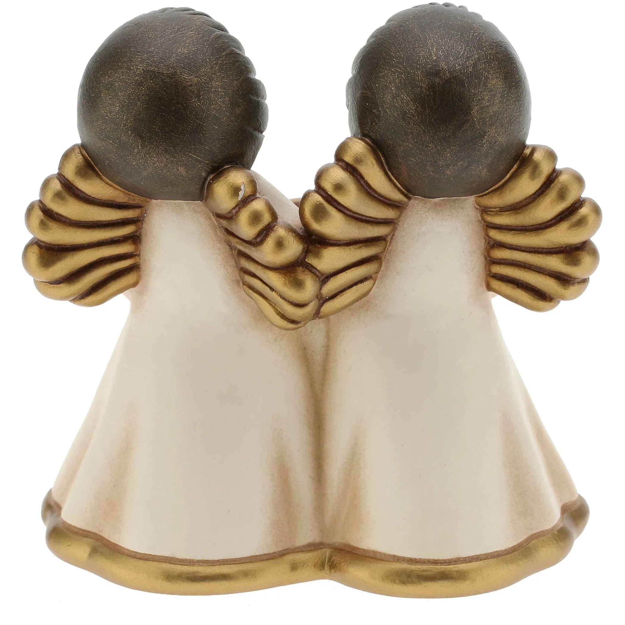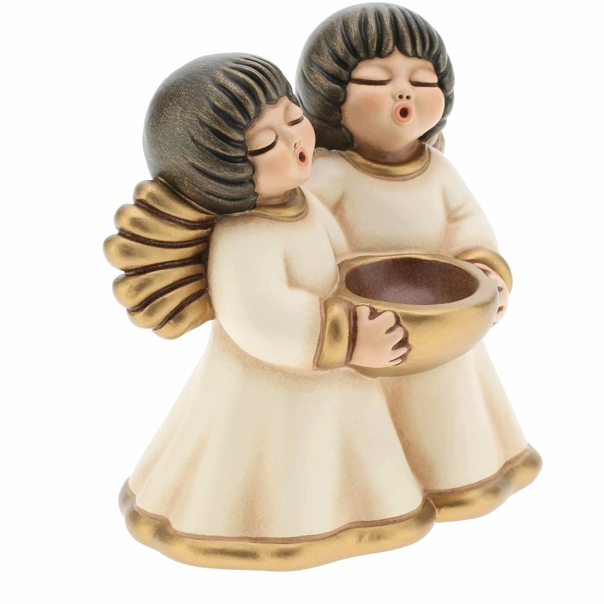 Due angeli dalle candide vesti e dalle ali dorate sorreggono con le mani un porta candela. Una preziosa creazione ceramica THUN per augurare protezione e felicità e regalare gioia e amore.