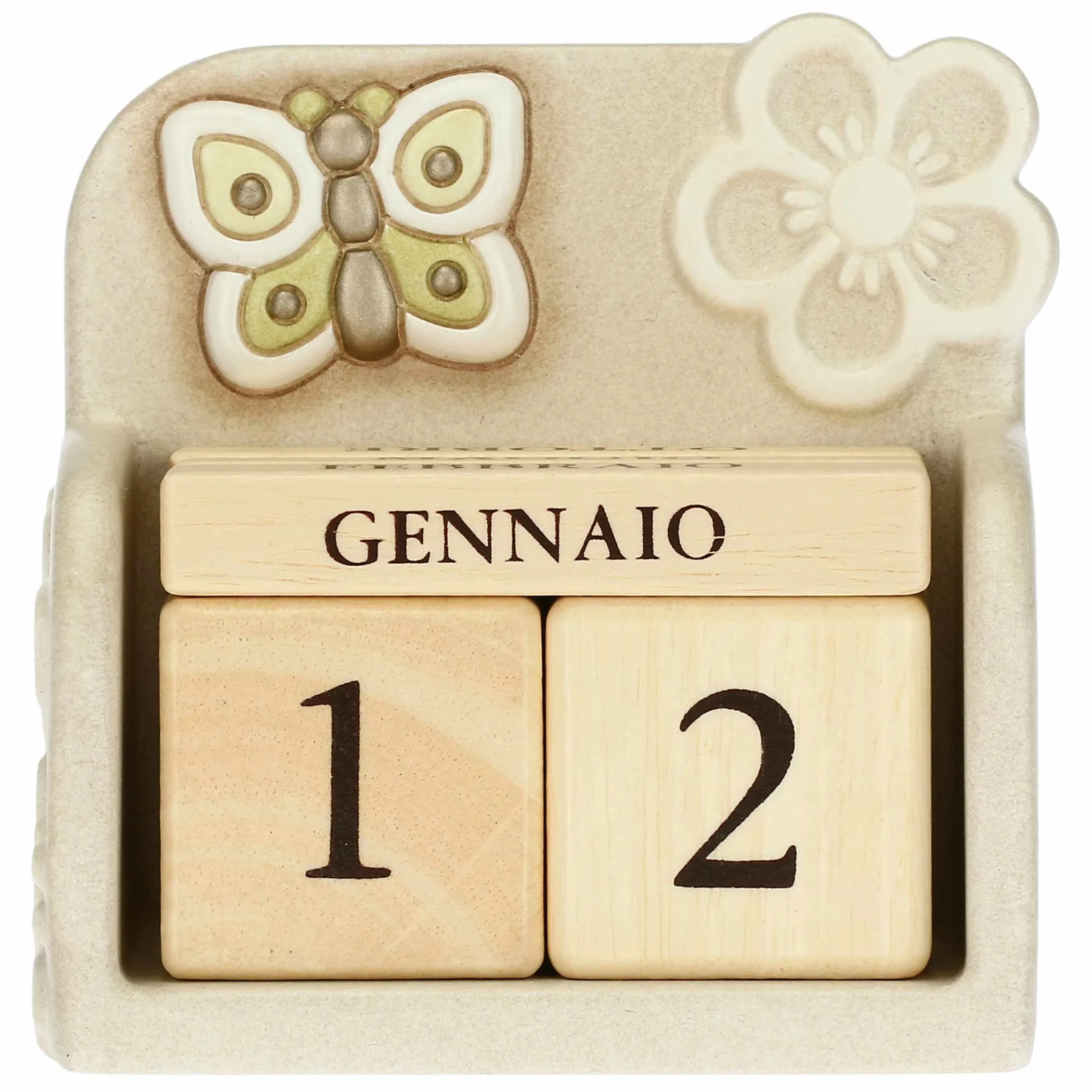 Oltre agli orologi, c’è anche un altro modo per tenere il tempo! Come? Con il calendario perpetuo da tavolo della linea Prestige. Realizzato in ceramica dipinta a mano, caratterizzata nella decorazione con il ricercato gioco di icone che da vita al tipico effetto “pizzo” bianco sul raffinato sfondo grigio. In questo alternarsi di superfici vuote e piene, si inserisce il delicato tocco di colore della farfalla modellata in bassorilievo. Per aggiornare quotidianamente la data, basterà ruotare i cubi in legno sino ad arrivare al mese e al giorno corrispondente. Perfetto quindi per tutti gli anni, ideale da regalare.