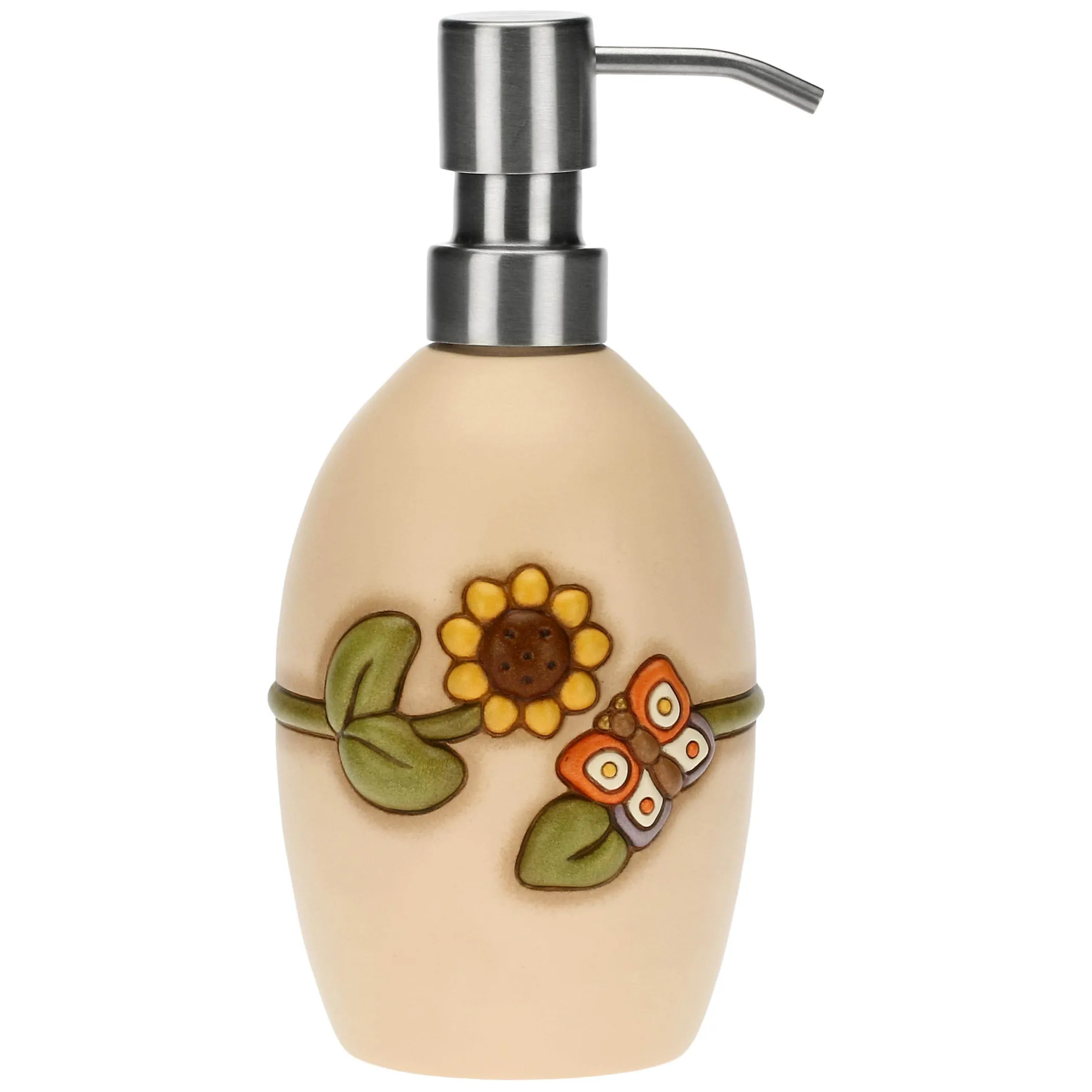 Il nuovo dispenser per sapone della linea Country regalerà un tocco di originalità al tuo bagno grazie alle decorazione con farfalla e girasole sulla ceramica decorata a mano. Abbinalo al porta spazzolini, al porta ovattine e al porta saponetta per un set completo da regalare, caratterizzato dal colore neutro che si adatta ad ogni stile.
