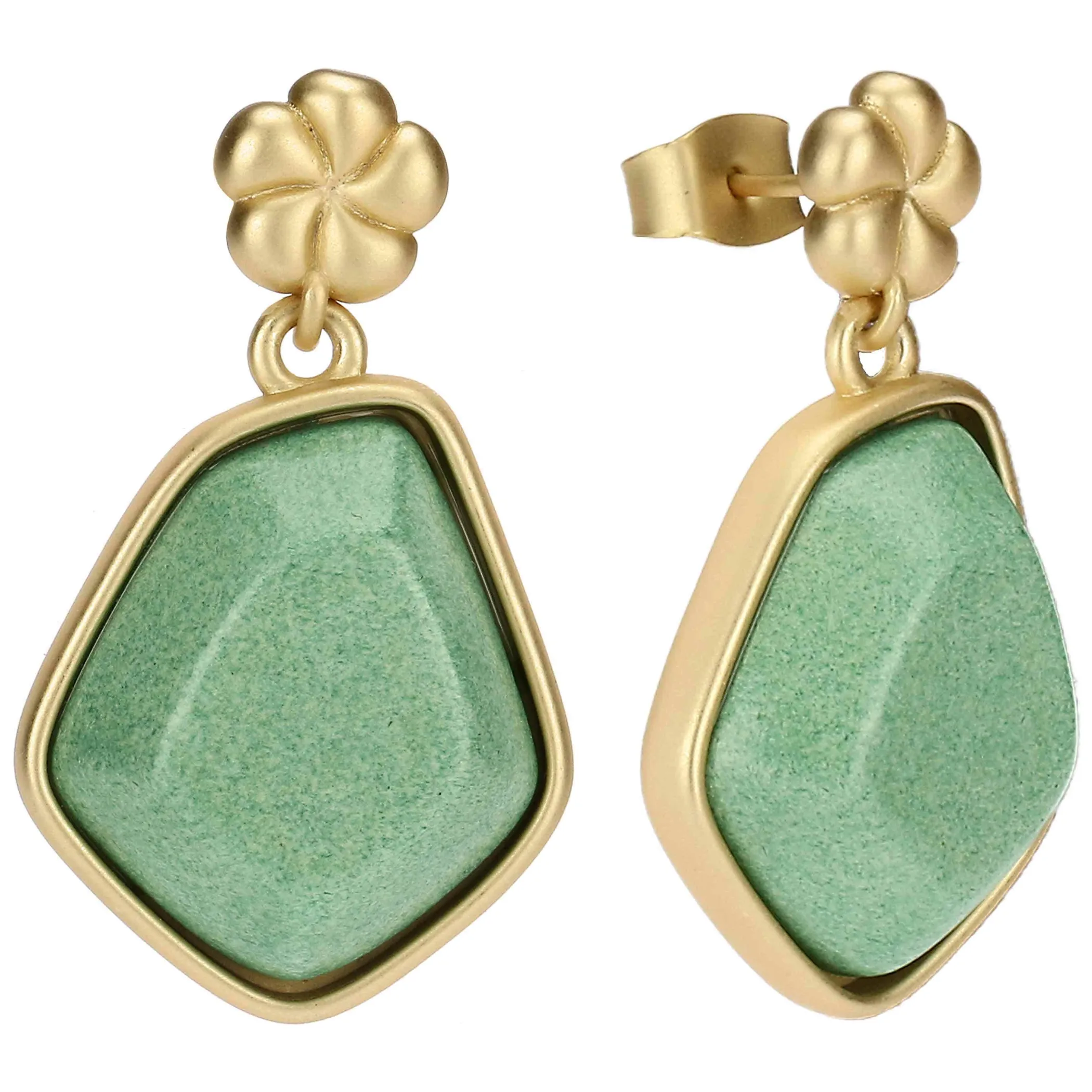 Gli orecchini pendenti con fiore e pietra sono un gioiello raffinato e delicato. La pietra verde in ceramica, elegante e raffinata, è abbinata a un piccolo fiore che aggiunge un tocco di delicatezza e stile. Questo accessorio si distingue per il suo design armonioso, ideale per chi cerca un equilibrio tra eleganza e originalità. Perfetti per completare un look sofisticato, questi orecchini da donna sono il dettaglio ideale per chi ama accessori che parlano di stile e bellezza naturale.